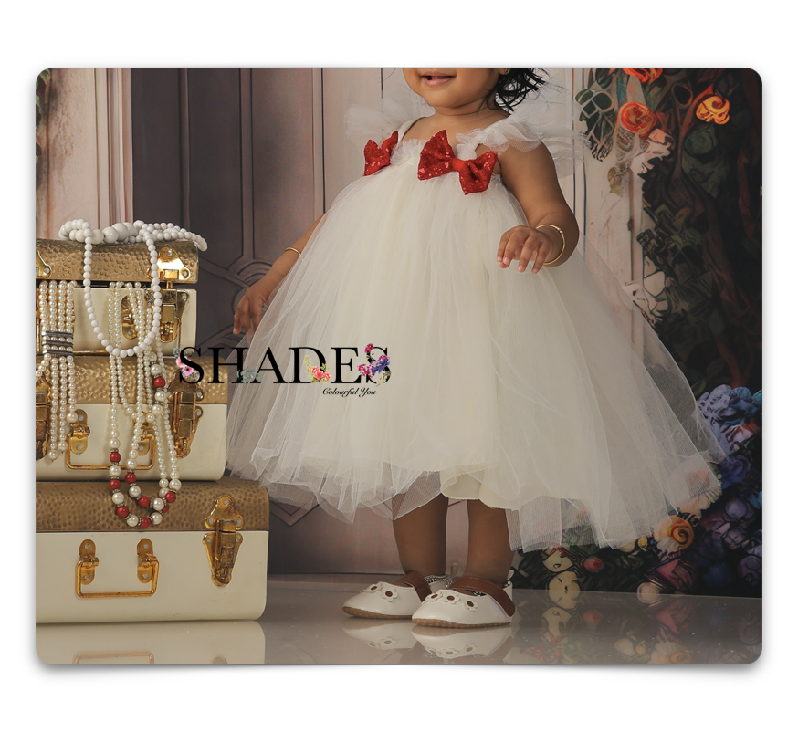 A delightful blend of festive charm and playful elegance — this frock features a soft net frill with glitter red bows. Paired with matching red bow hair accessories, it’s crafted to make every little girl shine and twirl.